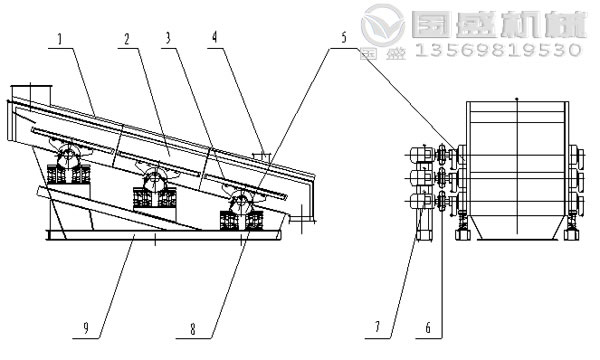 產品結構 ![]() 1.密封罩 2.篩箱 3.篩板 4.除塵口 5.激振器 6.軟連接裝置 7.電動機 8.減振彈簧 9.底托